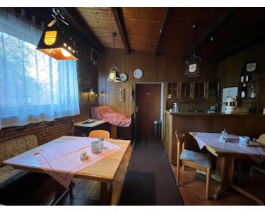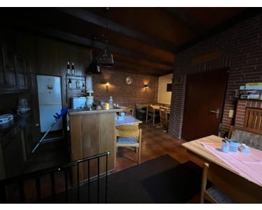 Im anderen Gebäudeteil finden 2 Wohnungen (Erdgeschoss und 1. Obergeschoss) und der Gastraum mit ca. 4 Tischen und mit Theke sowie die Küche ihren Platz. Der Keller bietet Abstellfläche und dort ist die Gaszentralheizung untergebracht.