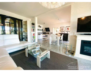 Der offen gestaltete Wohn- und Essbereich besticht durch große Fensterfronten, die viel Tageslicht hereinlassen und eine helle, einladende Atmosphäre schaffen. Die Möblierung ist modern und stilvoll, sodass Sie sich sofort wie zu Hause fühlen werden.