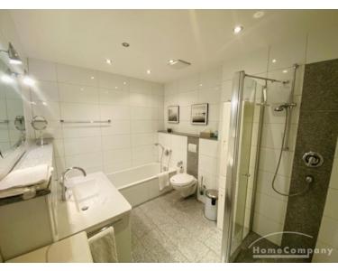 Das elegante Badezimmer verfügt über eine bodentiefe Dusche und einer Badewanne sowie hochwertige Armaturen. Hier können Sie in stilvollem Ambiente in den Tag starten oder ihn entspannt beenden.