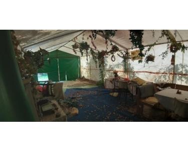 Auf dem Grundstück gibt es mehrere Gebäude, die umfassend saniert werden müssen: ein Holz-Lehm-Ziegel-Haus mit Keller, ein Leichtbau-Gebäude, ein Veranstaltungszelt und zwei Holzhäuser. Alle diese dienten früher der Zimmervermittlung. Doppelt breites Grundstück, romantische, intime Umgebung, Bäume, Sträucher, Obstbäume, Weinberg, hintere Grenze am Waldrand.
