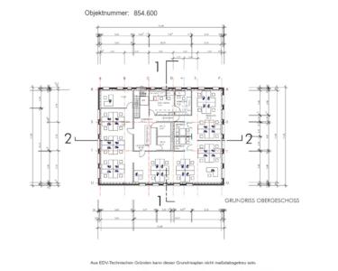 Im Erdgeschoss stehen großzügige 329 Quadratmeter zur Verfügung, im Obergeschoss weitere 330 Quadratmeter. Die Grundrissgestaltung wurde bewusst so gewählt, dass sich die Büro- und Besprechungsräume entlang der Außenwände erstrecken, was eine gute Belichtung und eine angenehme Arbeitsatmosphäre gewährleistet. Die zentral angeordneten Technik- und Sanitärräume optimieren die Effizienz der Arbeitsabläufe und ermöglichen eine praktische Nutzung des Gebäudekerns.