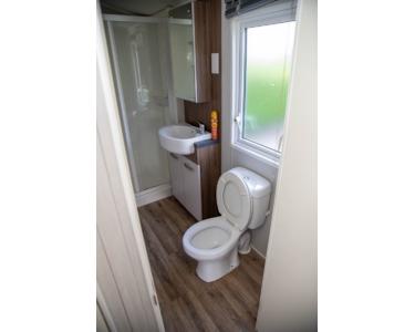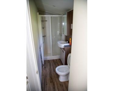 Badezimmer Dusche, WC, Waschbecken mit Möbeln.