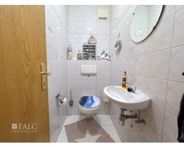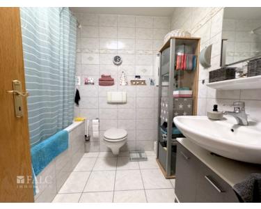Das Badezimmer sowie das Gäste-WC sind Deckenhoch gefliest und bieten durch ihre hochwertige Verarbeitung eine pflegeleichte und moderne Optik. Ein weiteres Highlight im Badezimmer ist die Badewanne, die zum Entspannen einlädt.