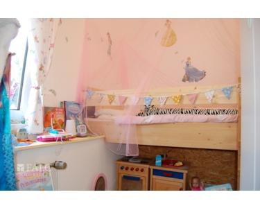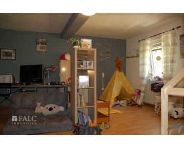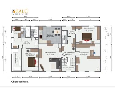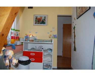 Das Obergeschoss bietet Ihnen mehrere Zimmer. Über das Treppenhaus erreichen Sie rechts eins der Zimmer, während Sie geradeaus in einen kleinen Flur gelangen, von dem aus Sie ein WC und ein Gästezimmer betreten können. Durch die Tür auf der linken Seite erreichen Sie das Wohnzimmer und die angrenzende Küche. Außerdem führt Sie ein weiterer Flur, der sich hinter dem Wohnzimmer verbindet, in ein Schlafzimmer, zwei kleine Kinderzimmer, ein Badezimmer und ein zusätzliches WC.
