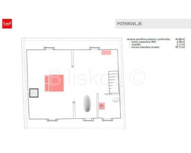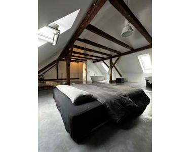 Das Dachgeschoss, das 66 m² umfasst, beinhaltet ein geräumiges Schlafzimmer, ein modernes Badezimmer und eine Treppe, die einen intimen Entspannungsbereich schafft.
