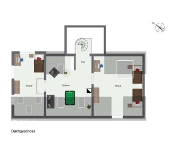 Im Dachgeschoss sorgen zahlreiche Fenster für viel Licht und Helligkeit. Neben dem Mittelraum gibt es zwei Räume die viel Platz für Möglichkeiten bieten und bei Nacht einen herrlichen Blick in den Sternenhimmel bieten.