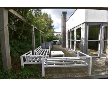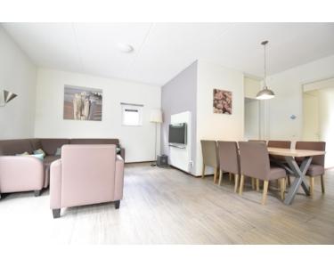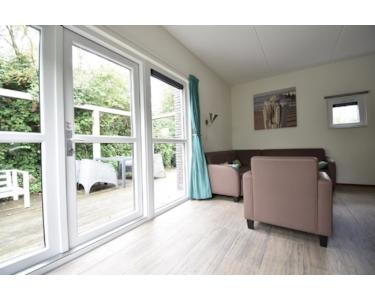 Das Wohnzimmer ist in einen Sitz- und einen Essbereich unterteilt. Die weißen Wände bilden einen schönen Kontrast zum holzfarbenen Boden und sind geschmackvoll eingerichtet. Durch die großen Fenster und die Gartentüren erhalten Sie viel natürliches Licht und können auf die Terrasse hinausgehen. Der vorhandene Heizkörper sorgt für eine angenehme Wärme auch in der kälteren Jahreszeit.