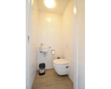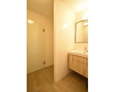 Das Badezimmer ist bis zur Decke in einer hellen Farbe gefliest. Auch hier gibt es einen Fußboden in einer Holzfarbe, der einen schönen Kontrast zu den Wandfliesen und den hellen Sanitärobjekten bildet. In diesem Bad kann man sich eine Stunde lang in der Badewanne entspannen oder duschen, wenn man weniger Zeit hat. Der Design-Heizkörper, das schöne Waschbecken und der große Spiegel vervollständigen das Bad.