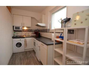 Küche komplett eingerichtet mit Waschmaschine, Herd, Backofen und Mikrowelle. Kein Geschirrspüler.