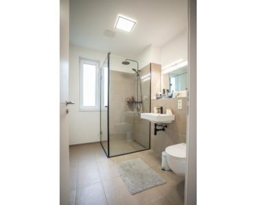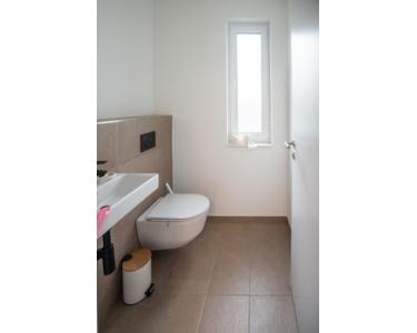Im Erdgeschoss befindet sich der großzügige Wohn-Ess-Bereich mit integrierter Küche und raumhohen Fenstern mit Zugang zur Terrasse. Über die gesamte Länge des Wohnzimmers finden sich Fenster, die überdurchschnittliche Helligkeit im Erdgeschoß bieten. Ebenso befindet sich hier ein Gäste-WC und der Hauswirtschaftsraum, der mit dem Haustechnikraum kombiniert ist. Es wurde modernste Technik (Wärmepumpe, Lüftungsanlage mit Energierückgewinnung, Verwendung erneuerbarer Energie) verbaut. Aus dem HWR erreichen Sie auch den hinteren Gartenbereich.