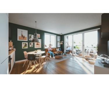 Die Wohnbereiche sind offen gestaltet und profitieren von großzügigen Fensterfronten, wodurch die Räume mit viel natürlichem Licht durchflutet werden. Umlaufende (Dach-) Terrassen und Balkone sorgen für eine großzügige Möglichkeit, sich im Freien aufzuhalten.