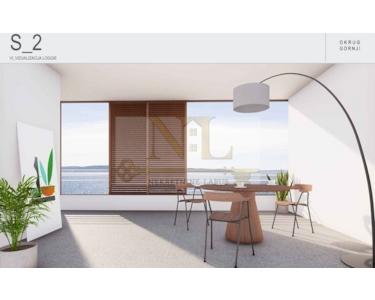 Wohnung S2, erster Stock, erste Reihe zum Meer, besteht aus: Flur, drei Schlafzimmern, zwei Badezimmern, Küche mit Esszimmer und Wohnzimmer, Loggia, überdachter Terrasse und Balkon. Es verfügt über einen Außenparkplatz.