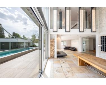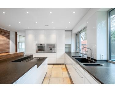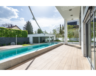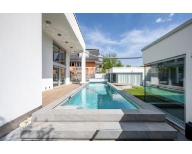 Glas, Holz und weiße Flächen sind die prägenden Elemente, die ein puristisch-modernes Umfeld mit behaglichem Flair schaffen. Dank der transparenten Architektur bietet das Haus interessante Blickachsen, die den Garten und die Natur einbeziehen. Die Ausstattung wurde auf höchstem Niveau realisiert.