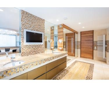 • luxuriöses Masterbad mit Marmor, Maßeinbauten, großer Walk-in-Dusche, Wannenpodest mit Kristall-Lichtobjekt, Doppelwaschtisch aus Granit, Toilette mit Bidet