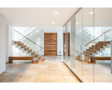 Hochwertige Naturmaterialien wie Nussholz kontrastieren mit weißen Wänden, Naturstein und beeindruckenden Glasflächen. So entstehen stimmige Räumlichkeiten, die hohen Ansprüchen an Stil, Komfort und Funktionalität gerecht werden.