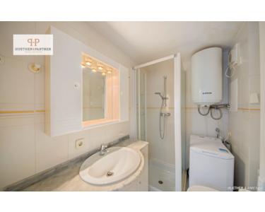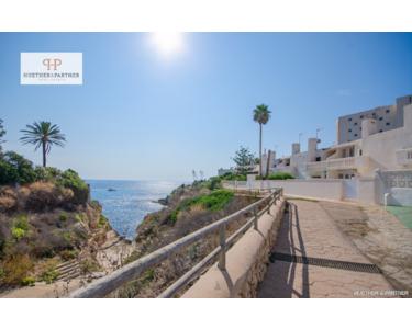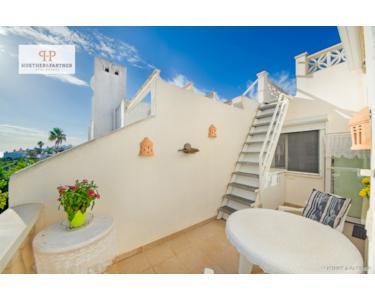Die Wohnung verfügt über 1 Doppel- und 1 Einzelschlafzimmer sowie einen Wohnbereich mit offener Küche. Vom Balkon mit Markise und Meerblick gelangt man über eine Treppe auf die Dachterrasse, deren Nutzung innerhalb der Gemeinschaft gestattet wurde. Einige Häuser nutzen diese Terrasse – vor allem aufgrund des Ausblicks – als Sonnenterrasse. Hier, wie auch im äußeren Eingangsbereich, wurden mehrere ventilierte und abschließbare Abstellräume geschaffen, sodass Sie Terrassenmöbel etc. sicher und trocken verstauen können.