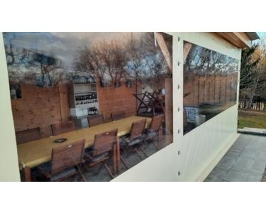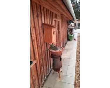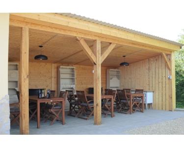In Fortsetzung der Bebauung wurde eine überdachte Terrasse von ca. 30 m2 errichtet, dreiseitig geschlossen, einseitig mit einer Plane verschlossen und beheizt. Vor dem Haus gibt es einen Ziergarten und hinter den Häusern einige Obstbäume. Aufgrund der Grundstücksgröße ist es auch ideal für die Haltung von Tieren, z.B. Pferden.