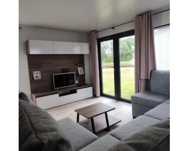 Auf der linken Seite des Chalets befindet sich das Wohnzimmer. Das Wohnzimmer ist geräumig und verfügt über ein Ecksofa mit ausreichend Platz für die ganze Familie. Außerdem gibt es hier einen Loungetisch und einen TV-Schrank mit Anschluss an den Fernseher.