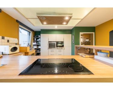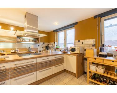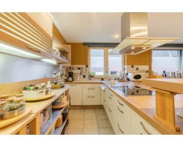 Geschlossene Küche (5,39 x 4,48 m) mit Einbauküche und Geräte wie zwei Backöfen, Geschirrspüler, Keramikkochfeld, Kühlschrank und Dunstabzugshaube.