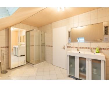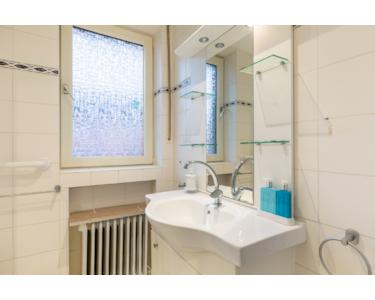 Badezimmer (4,28 x 3,28 m) mit Dusche, Badewanne, Waschtisch und WC.