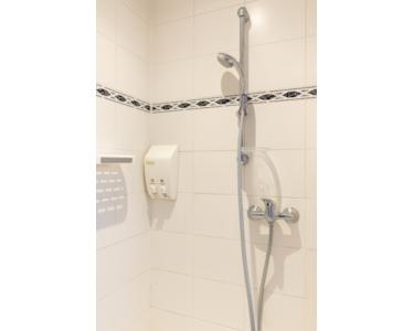 Bad (2,16 x 1,53 m) mit Dusche und Waschbecken.