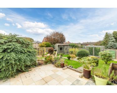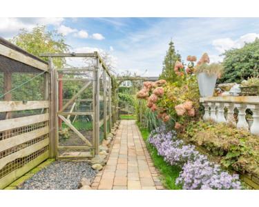 Garten mit Rasen, Sträuchern, Hecke, Teich und Blumenbeeten.