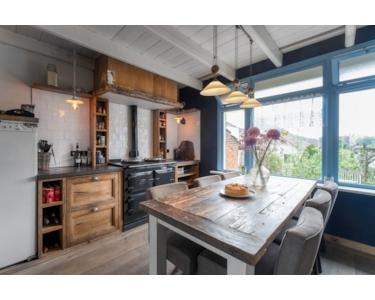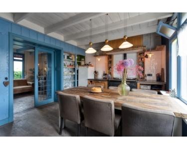 Durch die authentischen Schiebetüren gelangt man in die halboffene Küche und in den Essbereich.