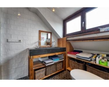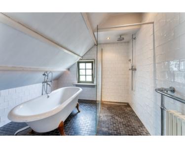 Über die Treppe in der Zwischenhalle erreichen Sie den Treppenabsatz des ersten Stocks. Diese Etage bietet Zugang zu zwei geräumigen Schlafzimmern und einem Badezimmer. Das Badezimmer ist sehr geräumig und verfügt über eine Badewanne, eine begehbare Dusche, ein Doppelwaschbecken und eine separate Toilette.