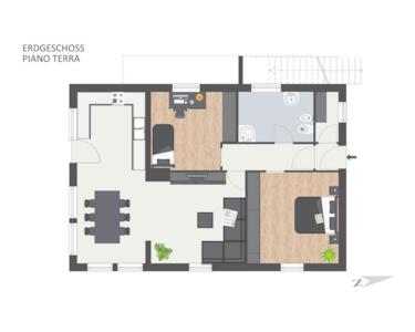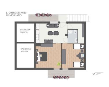 RAUMAUFTEILUNG OBERGESCHOSS: Eingangsbereich, Wohnzimmer, 2 Schlafzimmer, großzügige Wohnküche mit Ess-Bereich und Zugang zur Südterrasse mit Privatgarten, großes Bad mit Fenster.