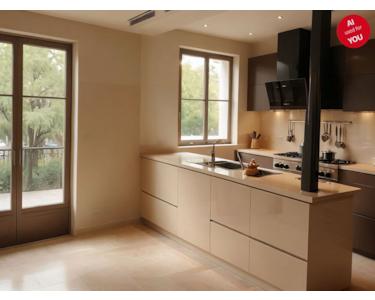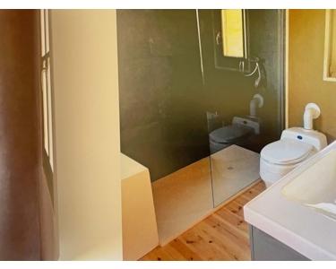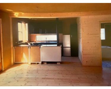 RAUMAUFTEILUNG: Eingangs-Wohn-Kochbereich mit Holzofen, 1 Schlafzimmer, großes Bad mit Fenster (8m²),
