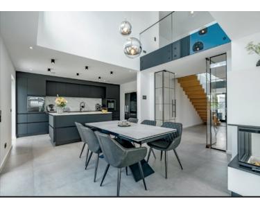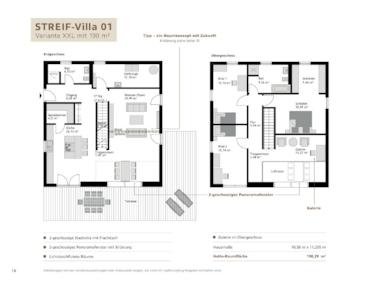 Die STREIF-Villa überzeugt durch ihr modernes Bauhausdesign, ergänzt um einen stilvollen Erker mit eindrucksvoller Glasfront. Diese Villa ist in verschiedenen Grundrissgrößen erhältlich - L, XL und XXL - und bietet ein offenes Raumkonzept mit einem großzügigen Wohn-, Ess- und Kochbereich von 50 m². Die durchgängige Glasfront erstreckt sich über beide Stockwerke und öffnet den Blick vom Obergeschoss, wo eine elegante Galerie für ein offenes und luftiges Raumgefühl sorgt.