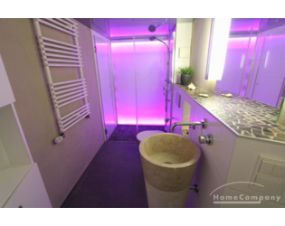 Bad: Ein Highlight auf nur 4,4 m²! Das luxuriöse Designer-Badezimmer verfügt über eine Lichtwand, eine Spanndecke, einen freistehenden Waschtisch und eine bodenebene Dusche.