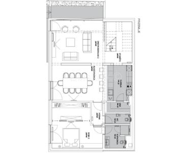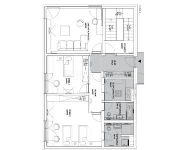 Obergeschoss: Eingang (8,70 m2, Treppenhaus (10,68 m2), Wohnzimmer (24,33 m2), Flur (4,36 m2), Hauswirtschaftsraum (5,84 m2), Badezimmer (4,68 m2), Zimmer 1 (14,98 m2), Zimmer 2 ( 24,35 m2), Badezimmer (5,27 m2), Abstellraum (5,25 m2).