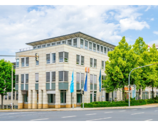 Das Gebäude überzeugt mit moderner Architektur, einer ansprechenden Natursteinfassade und dem prägnanten Turm.