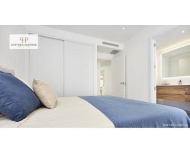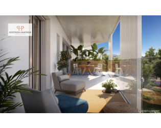 Alle Wohnungen haben ein großzügiges Wohnzimmer mit Glasfront zur Terrasse, offener Küche und integriertem Esszimmer, sodass die maximale Nutzung des Tageslichts ein Gefühl von Weitläufigkeit vermittelt. Die Apartments haben jeweils zwei Schlafzimmer und zwei Bäder, eines davon en-suite.