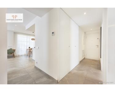 Für alle Räume der Wohnungen wurden großformatige Porzellanbodenfliesen der Marke Saloni ausgewählt. Die Verfliesung der Terrassen erfolgt mit demselben Modell in rutschfester Ausführung.