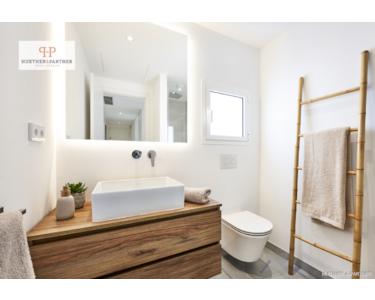 Die Bäder sind mit Hängewaschtischen aus Holz mit einem oder zwei Waschbecken je nach Bauplanung, Dusche mit bodengleicher Duschtasse und Unterputzarmaturen von Tres ausgestattet.