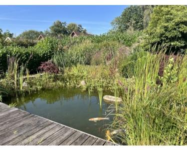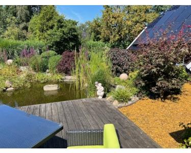 Hier präsentieren wir Ihnen eine absolute Wohlfühl-Immobilie. Stellen Sie sich vor, draußen ist es grau, kalt und regnerisch und Sie legen sich in Ihre Whirlpool-Badewanne oder Sie genießen das Dampfbad. Danach können Sie im Wohnzimmer ganz entspannt ein Buch vor dem Kamin lesen oder einfach den Blick auf den Zierteich genießen. In den warmen Monaten können Sie es sich auf einer der beiden Terrassen im eingefriedeten Garten gutgehen lassen.