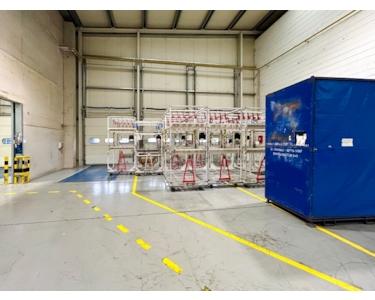 Die Halle verfügt über jeweils drei Tore an der Vorder- und Rückseite, die über insgesamt sechs Rampen erreichbar sind.