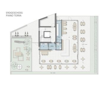 RAUMAUFTEILUNG: große Show-Küche mit Aufzug, vorgelagerter Tresen, rund 40 Sitzplätze im Innenbereich, weitere 36 auf der Sonnenterrasse, Vorraum, Damen-Herren-WC's, ebenerdiger Stauraum weiteres Magazin im Untergeschoß
