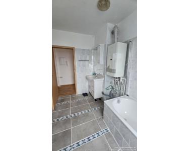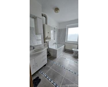 Im Tageslicht-Badezimmer befinden sich Waschbecken, WC und Badewanne sowie ein Anschluss für die Waschmaschine. Außerdem ist hier die Gastherme der Etagenheizung eingebaut, die Heizung und Warmwasseraufbereitung übernimmt.