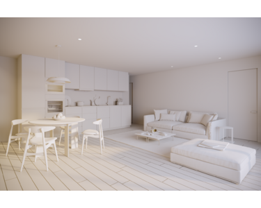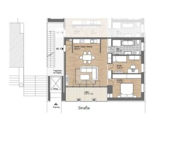 Sobald man diese Wohneinheit im Erdgeschoss betritt, fällt der Blick direkt auf die großzügige Loggia, durch die der offene Wohn- und Essbereich mit viel Tageslicht gefüllt wird. Damit befindet man sich auch im Herzstück der Wohnung mit ca. 40 m ², von dem aus alle anderen Räumlichkeiten zugänglich sind.
