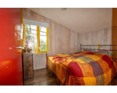 Dieses Schlafzimmer ist in fröhlichen Farben gehalten und mit modernem Holz an der Wand verkleidet. Es verfügt über einen Schrank und ein Doppelbett.
