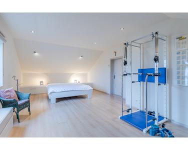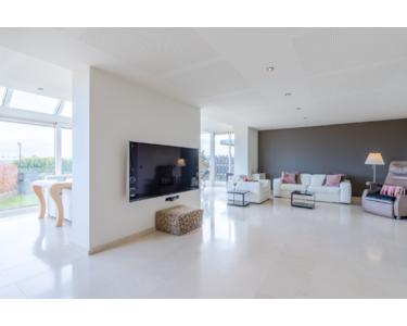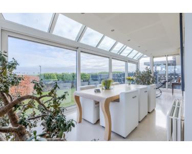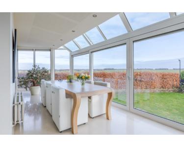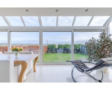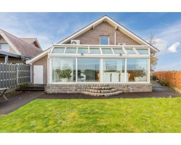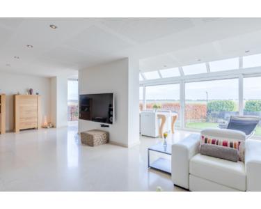 Das Wohnzimmer mit verglastem Anbau, der auch als Wintergarten bezeichnet werden kann, bietet einen traumhaften Blick auf die umliegenden Felder. Diese Oase der Ruhe und des Lichts ist ein Highlight des Hauses. Die luxuriöse Küche ist mit modernen Geräten ausgestattet und macht das Kochen zum Vergnügen.