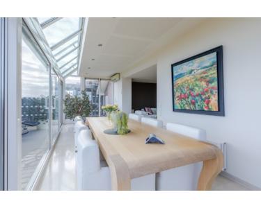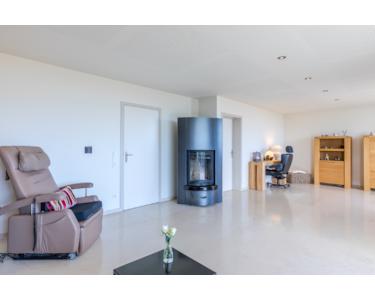 Wohnzimmer mit angebautem Wintergarten, großer Schiebetür, Holzofen, Klimaanlage und Travertinboden. Die große Glasfront ermöglicht optimalen Gartenkontakt und einen fantastischen Blick über die Felder.