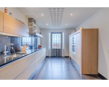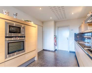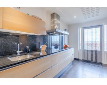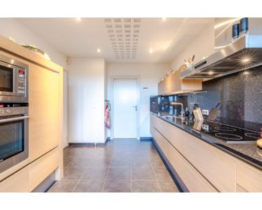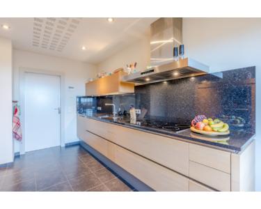 Geschlossene Küche mit luxuriöser Einbauausstattung inkl. Geschirrspüler, Backofen, Mikrowelle, Induktionskochfeld, Kühlschrank, Gefrierschrank, Granitarbeitsplatte und Dunstabzugshaube. Abstellraum.