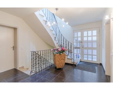 Repräsentativer Eingangsbereich mit zeitlosem Fliesenboden, Treppenhaus und separatem WC.