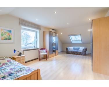 Das Erdgeschoss ist barrierearm gestaltet und verfügt über ein komfortables Schlaf-/Gästezimmer sowie ein Büro, ideal für Homeoffice oder als zusätzlicher Hobbyraum. Das Badezimmer im Erdgeschoss ist renovierungsbedürftig.