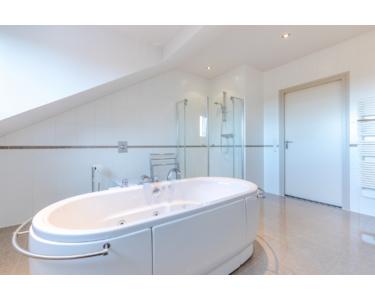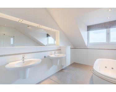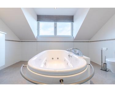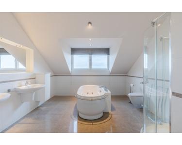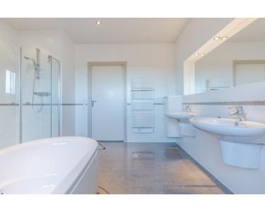 Das zweite Badezimmer überzeugt ebenfalls durch eine hochwertige Ausstattung mit freistehender Badewanne, zwei Waschbecken, separater Dusche und WC.