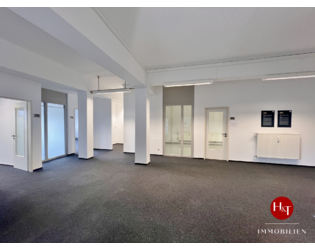 Die Gewerbefläche liegt im Hochparterre- und Kellergeschoss und ist von einer Rampe mit Treppenaufgang zu erreichen. Über eine doppelflügelige Eingangstür ist die Bürofläche mit ca. 140 m² im Hochparterre zu erreichen. Hier werden Sie von einem ca. 52 m² großen Empfangs-/Großraumbüro empfangen. Von diesem sind zwei weitere Büroräume mit großen Fensterfronten sowie ein separater Server- oder Archivraum zu erreichen. Ihnen und Ihren Mitarbeitern steht außerdem ein ca. 26 m² großer Aufenthaltsraum mit Einbauküche zur Verfügung.